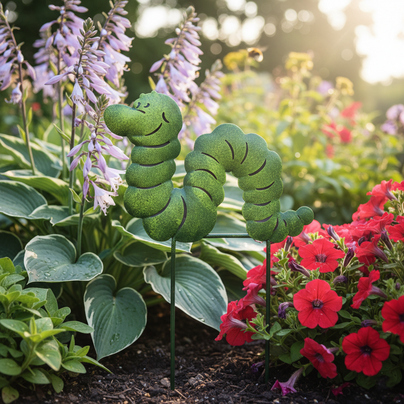 Aggiungi un tocco di allegria e un sorriso al tuo verde con questo simpatico Bruco Decorativo in Metallo!