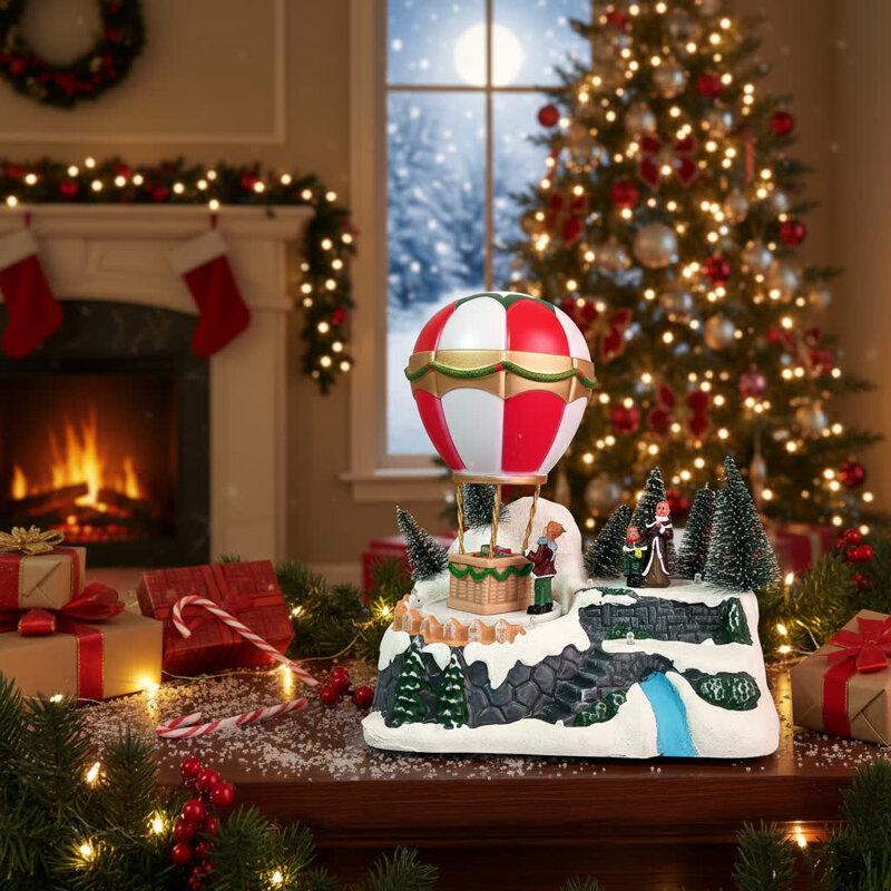 Il modello presenta un suggestivo paesaggio invernale innevato con abeti, un piccolo ruscello e due figure umane. Il punto focale è la grande Mongolfiera a strisce rosse e bianche che aggiunge un tocco di sogno e avventura alla scena.